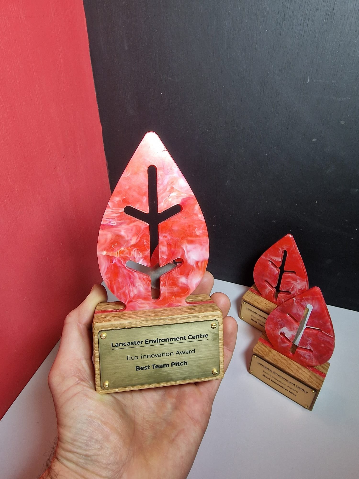 We matched Lancaster University colours using reds and whites which came from Celebration tubs and DVD cases to create some small sheets which we then cut to a leaf shape, shape it to fit with two pieces of FSC oak and finished off with a laser cut plaque.