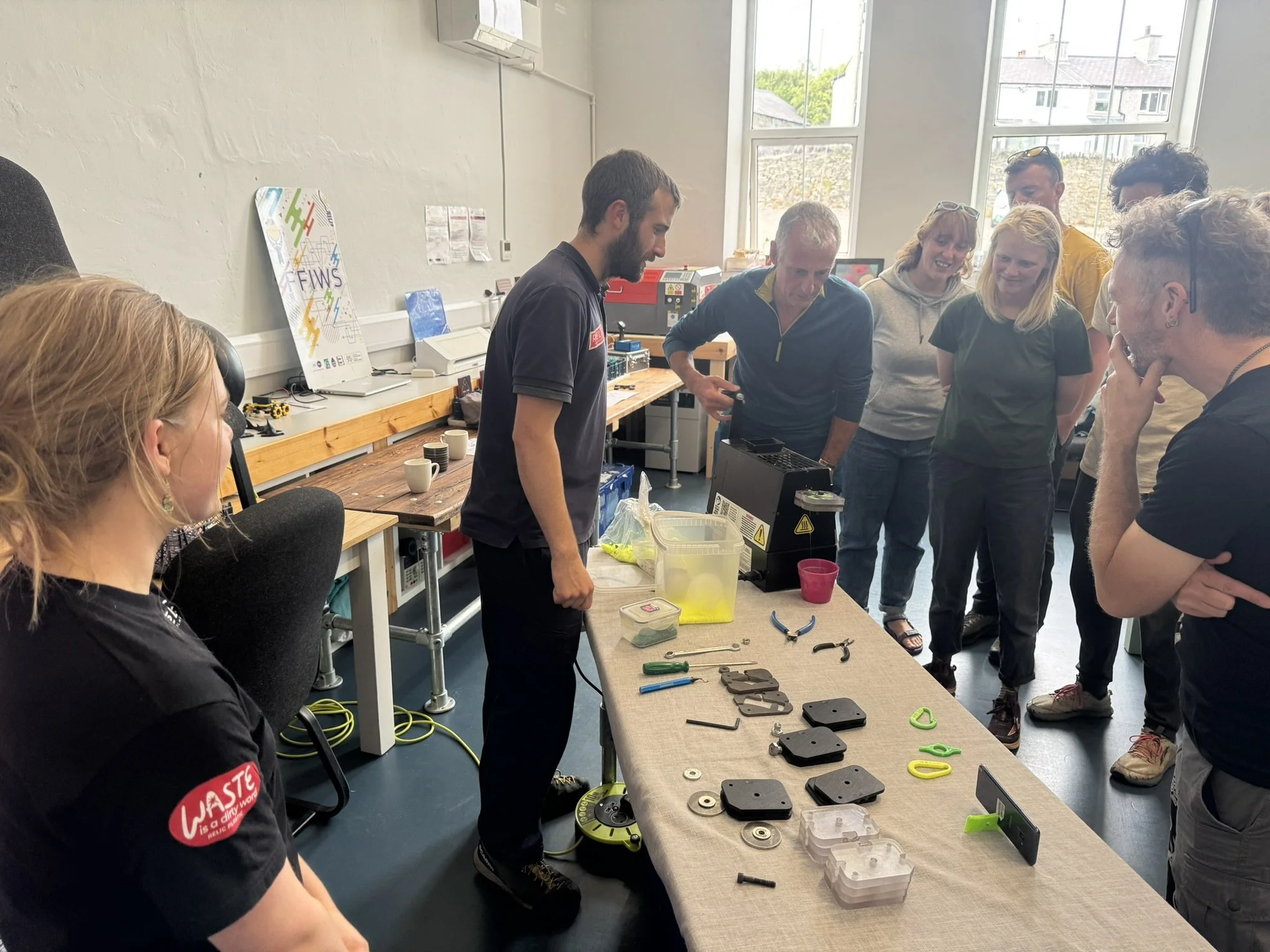 A great collaboration with Snowdonia Gear Repair creating recycled plastic buttons using our portable benchtop recycling setup and then being shown how to sew said buttons onto garments from Rosanna.